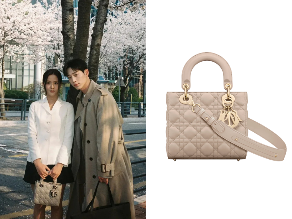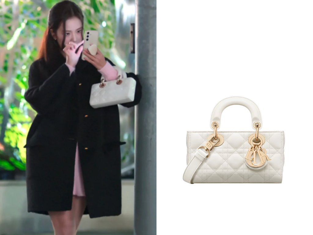身為稱職的品牌大使,Jisoo在劇中當然少不了Dior的加持。這款裸粉色的Lady Dior擁有立體方正的輪廓,搭配標誌性的Cannage籐格紋車線與客製化金屬吊飾,辨識度極高。作為一款經典的名牌手袋,它無論手提或肩背都能輕鬆展現法式高級感,是提升職場優雅氣質的穿搭利器。