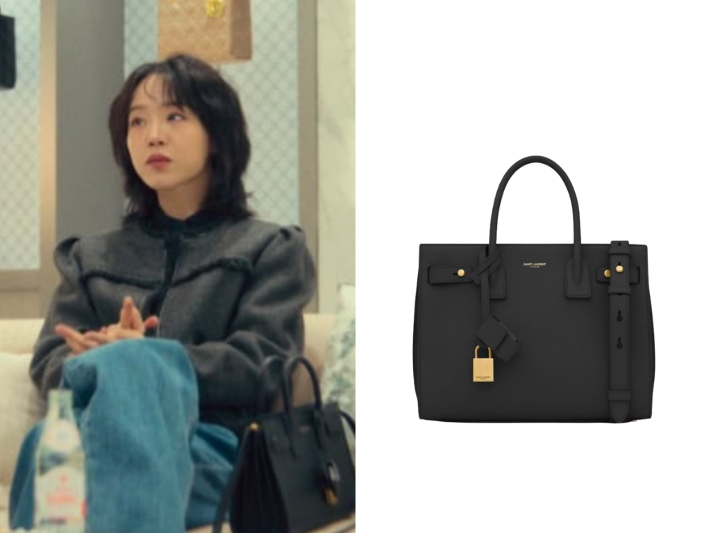 許多職場女性最愛的名牌手袋清單中,Saint Laurent的Sac De Jour絕對榜上有名!申慧善在劇中隨手一放的黑色Nano尺寸更顯俐落精緻,結構分明的梯形輪廓與低調的黃銅掛鎖,呈現出一種冷靜而理性的法式優雅。這款名牌手袋完美呼應了金莎拉幹練的造型,暗示她在名利場中始終保持精準的控制力。