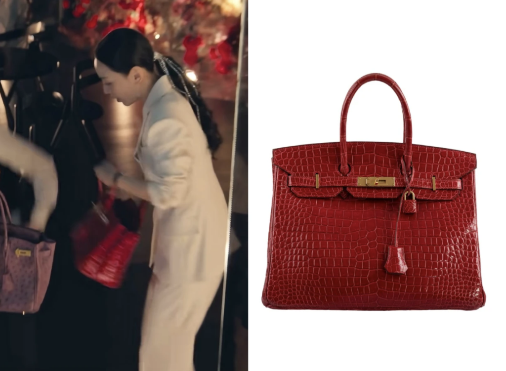 說到象徵極致身分與財富的頂級名牌手袋,絕對非這款「包王」Hermès Birkin莫屬!劇中金莎拉穿著一身俐落白色套裝,手提這只在2011年推出、價值過千萬元的頂級大紅色鱷魚皮柏金包霸氣登場。這款珍稀的名牌手袋大有來頭,不僅選用頂級Porosus鱷魚皮,鎖扣更由鑲滿閃耀鑽石的18K白金打造,明豔的紅色皮革配上鑽石光芒,在拍賣市場上因極度稀有而價格狂飆。最令人震撼的是,金莎拉在劇中竟將這款天價的名牌手袋當作隨手送出的「賠罪禮物」來交換另一只包款,完美詮釋了名流圈中以奢華包包大打心理戰的權力遊戲!