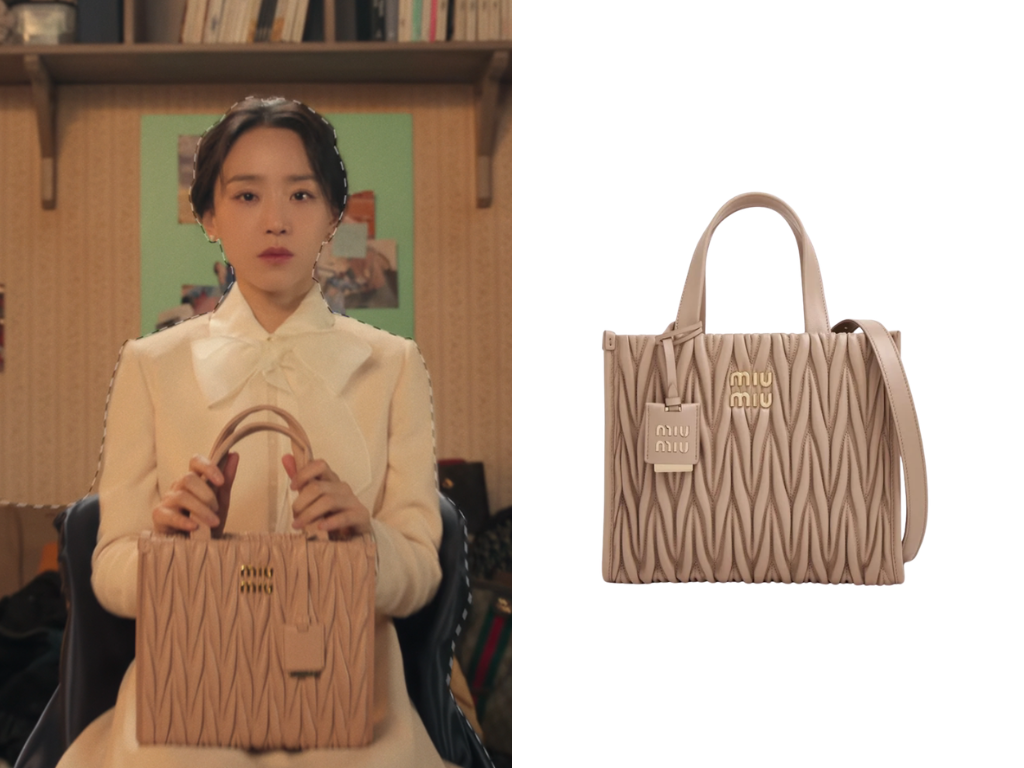 想要兼具美貌與實用容量的名牌手袋?申慧善在變裝環節拎出的Miu Miu托特包就是完美示範!採用品牌經典的Matelassé Nappa皮,特殊的車縫工藝形成細緻菱格紋與波浪般的立體皺褶。這款大容量的名牌手袋充滿少女氣息,無論手提或肩背都非常百搭,也展現出角色在強勢之外偶爾流露的柔軟與真實。