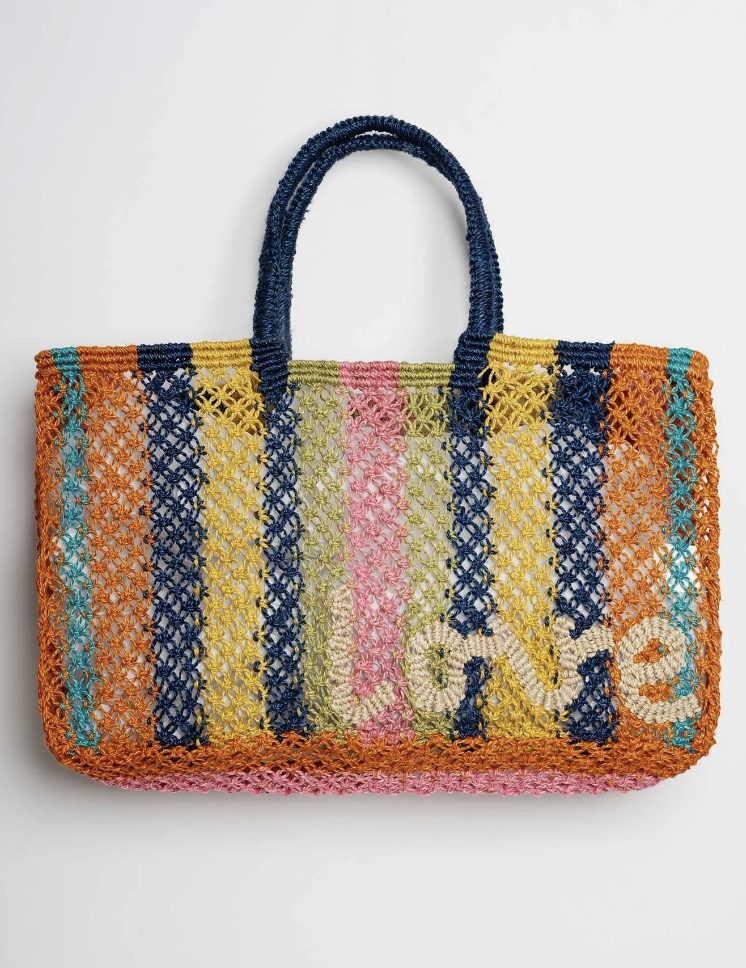 The Jacksons編織包以深藍色提手搭配多彩條紋包身,可愛的「Love」字樣設計,充滿夏日趣味。其天然編織材質與繽紛色彩完美呼應 Portugal Girl Aesthetic穿搭對俏皮配件與自然氣息的追求,是打造地中海度假風情的點睛之選。