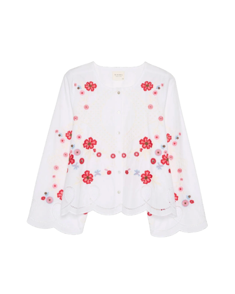 Sissel Edelbo這款白色上衣採用輕盈透氣的天然面料,飾以精緻的紅色花卉刺繡與鏤空波浪下擺,版型寬鬆且充滿空氣感。其充滿手作溫度的細節完美呼應Portugal Girl Aesthetic穿搭中對天然材質的推崇,能輕鬆營造出慵懶隨性且高級的地中海度假氛圍。