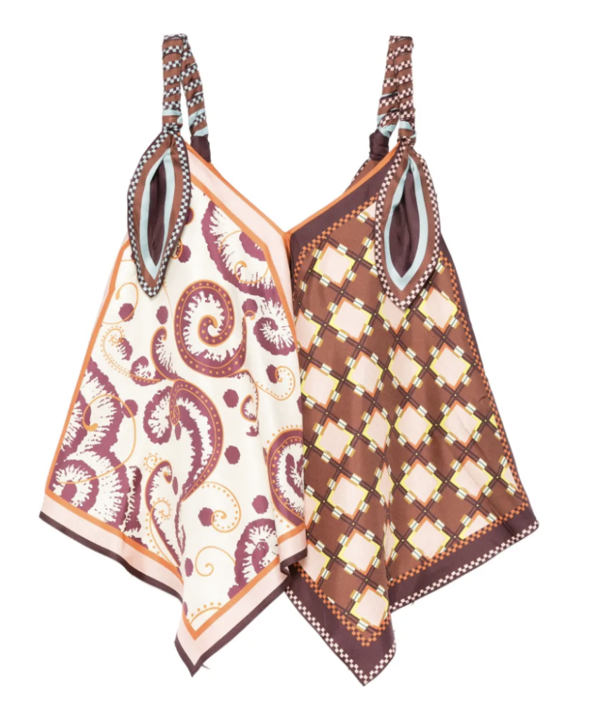 ALEMAIS Wilson絲質背心以獨特的民族風印花為主,用兩種大膽的圖騰印花拼接,搭配綁帶領口設計與精緻滾邊細節,完美詮釋Portugal Girl Aesthetic的印花混搭精神,能為造型增添復古隨性的地中海度假氛圍。