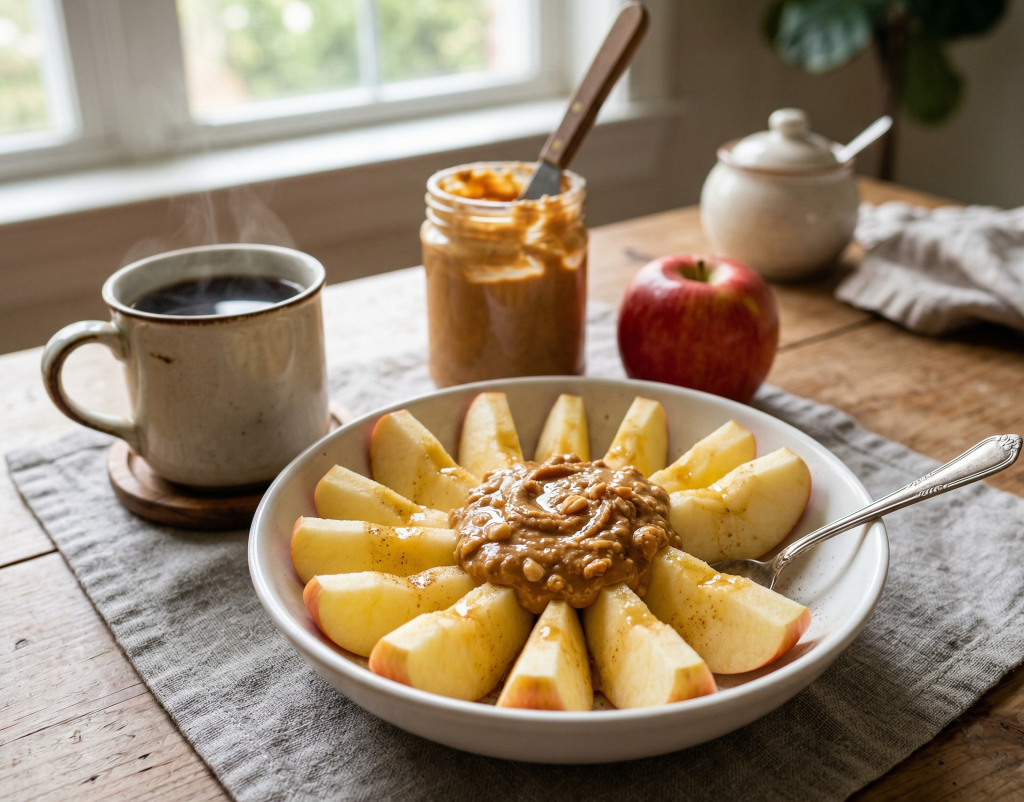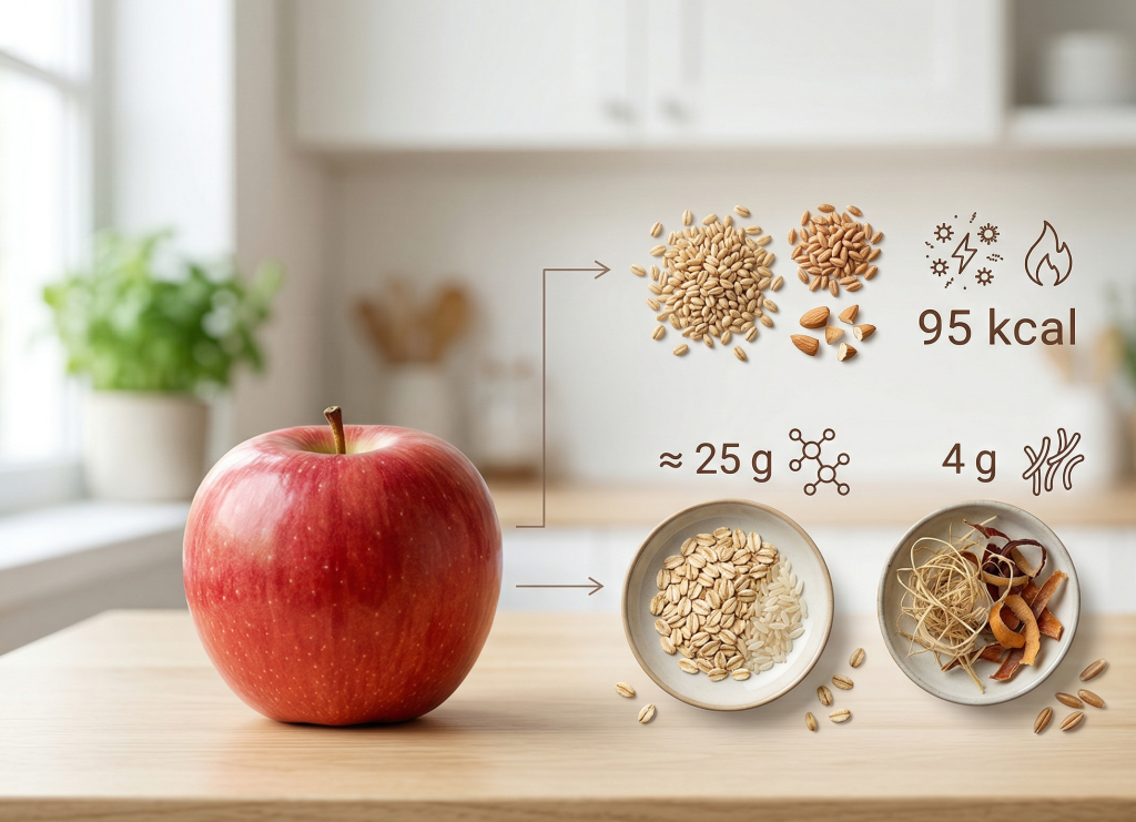 一顆中等大小的蘋果大約含有95大卡、25克碳水化合物以及4克膳食纖維。蘋果本身富含膳食纖維與維他命C,屬於低GI食物,有助於促進腸胃蠕動。而花生醬則含有優質蛋白質與健康的不飽和脂肪酸,能為身體提供能量。兩者結合,能在控制總卡路里的前提下,提供更全面的營養來源。