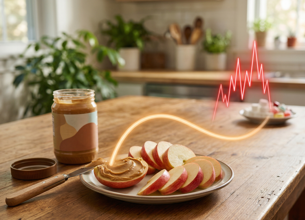雖然蘋果是健康水果,但單吃水果仍會讓血糖有所波動。這時候,花生醬裡的優質脂肪與蛋白質就發揮了極大的作用!將蘋果加花生醬搭配著吃,可以有效減緩身體吸收糖分的速度,避免血糖快速上升又下降的波動。當血糖穩定時,體內的胰島素就不會過量分泌,進而能減少脂肪合成與堆積的機會,有助於長期體態管理。