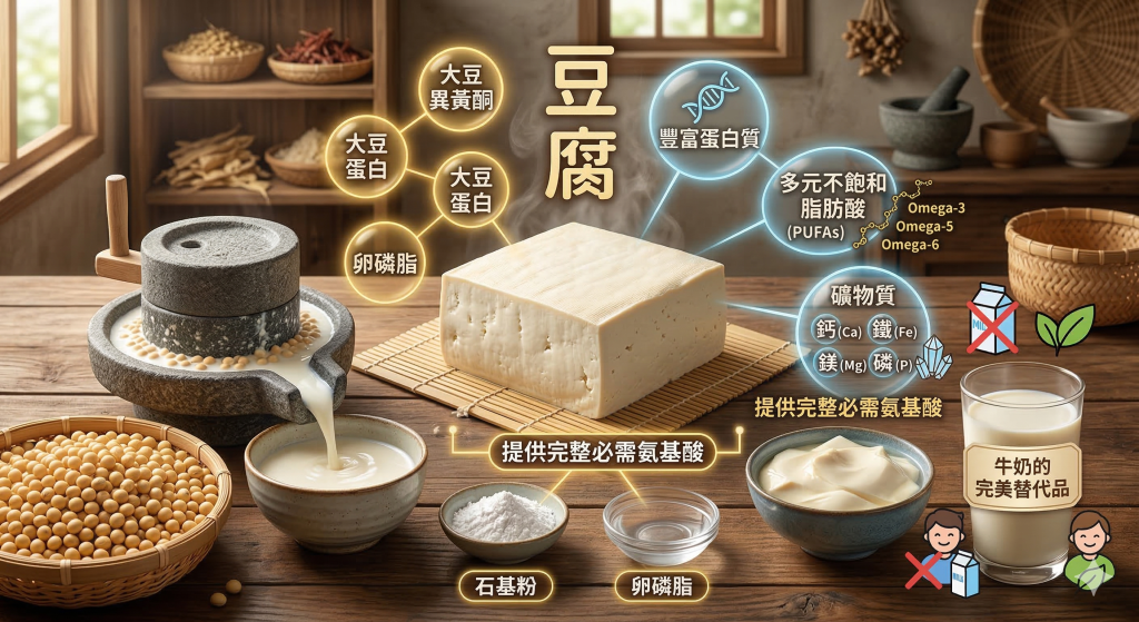 豆腐源自大豆家族成員黃豆,經磨漿後加入石膏或鹽滷壓實而成。其主要成分包含豐富的蛋白質、脂肪和碳水化合物,同時含有極高的多元不飽和脂肪酸,例如 Omega-3 和 Omega-6。在礦物質方面,豆腐富含鈣、鐵、鎂及磷等元素。除此之外,豆腐更含有大量大豆異黃酮、大豆蛋白以及卵磷脂,能為人體提供充足且完整的必需氨基酸,營養價值極高。對於患有乳糖不耐症或是嚴格執行素食飲食的人群而言,營養豐富的豆腐更是牛奶的完美替代品。